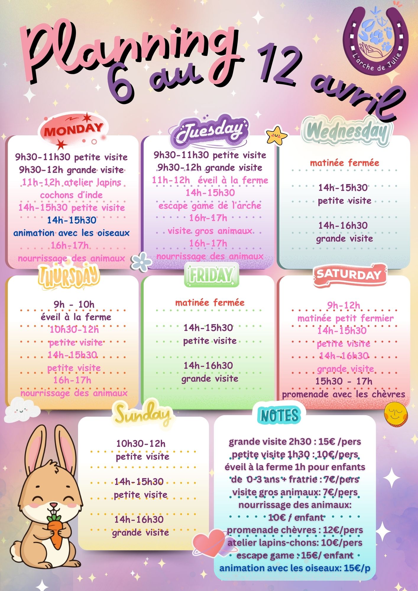 Venez trouver les œufs en chocolat cachés dans les parcs des petits animaux et également récolter les œufs des poules pour les colorier. Un concours photo du plus bel œuf sera ensuite organisé pour gagner un bon cadeau de l'arche.